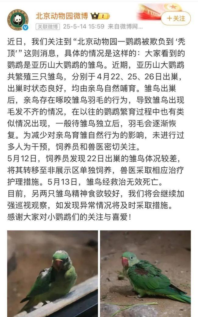 北京动物园官方账号回应,网络流传的“秃头”鹦鹉为园区亚历山大鹦鹉的雏鸟之一。近期,亚历山大鹦鹉共繁殖三只雏鸟,分别于4月22、25、26日出巢,出巢时状态良好,均由亲鸟自然哺育。雏鸟出巢后,亲鸟存在啄咬雏鸟羽毛的行为,导致雏鸟出现毛发不齐的情况,在以往的鹦鹉繁育过程中也有类似情况出现,一般待雏鸟独立后,羽毛会逐渐恢复。为减少对亲鸟育雏自然行为的影响,未进行过多人为干预,饲养员和兽医密切关注。