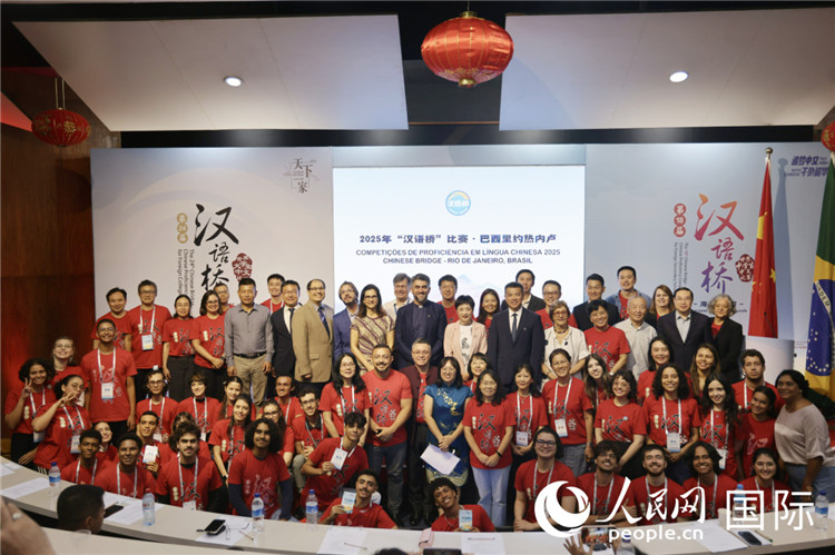 2025年“汉语桥”巴西赛区决赛颁奖环节,获奖选手同颁奖嘉宾合影。人民网记者时元皓摄