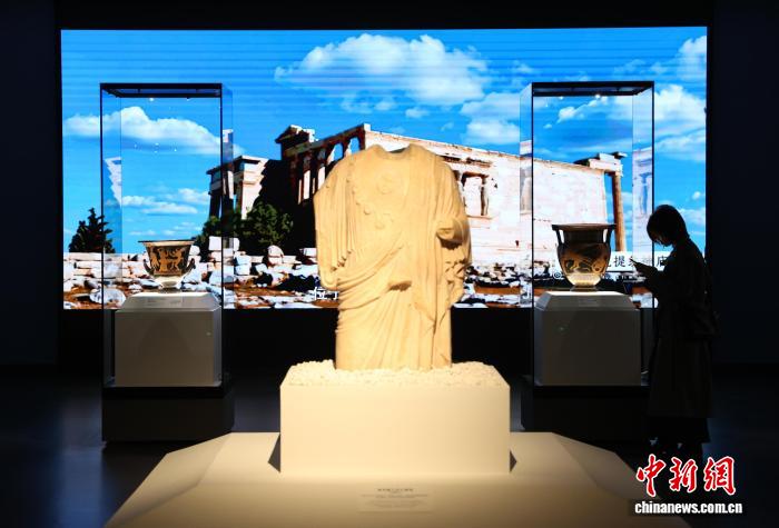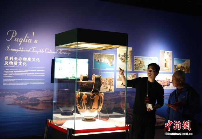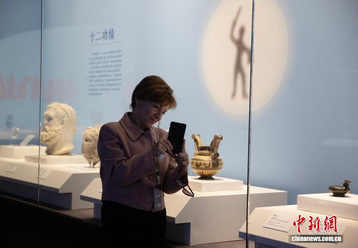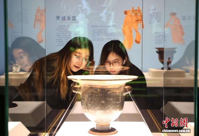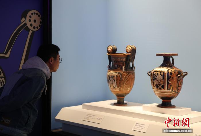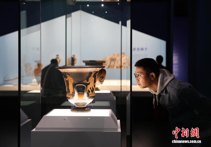 图为市民在博物馆内参观阿普利亚式红绘萼形调酒缸。中新社记者 于晶 摄