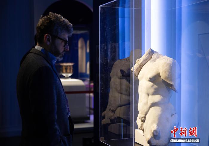 图为意大利工作人员在博物馆内参观赫拉克勒斯雕像。中新社记者 于晶 摄