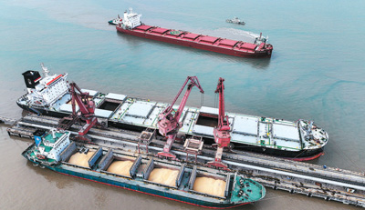 图为4月24日,一艘满载巴西大豆的散货船驶入宁波舟山港老塘山作业区,靠泊该港区三期1号泊位。
