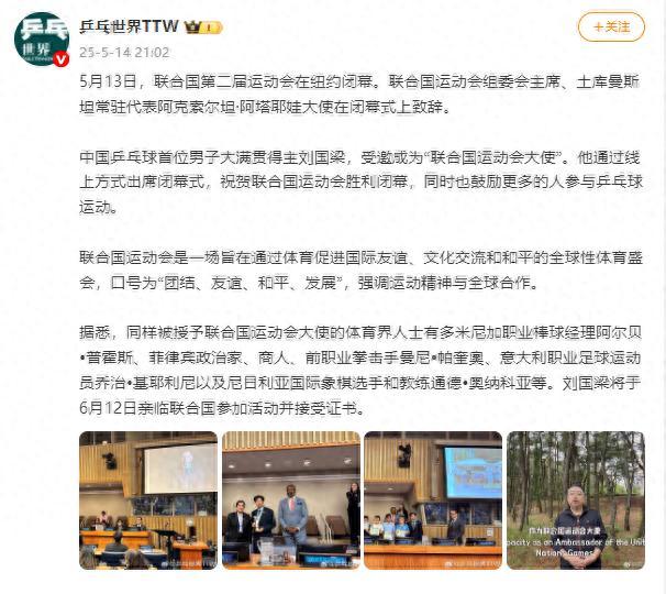 5月13日,联合国第二届运动会在纽约闭幕。闭幕式上,联合国运动会组委会主席、土库曼斯坦常驻代表阿克索尔坦·阿塔耶娃大使发表了致辞。中国乒乓球首位男子大满贯得主刘国梁受邀成为“联合国运动会大使”,并通过线上方式出席了闭幕式。他祝贺联合国运动会圆满结束,并鼓励更多人参与乒乓球运动。