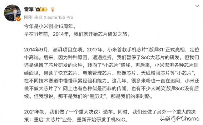 小米的芯片研发始于2014年的“澎湃项目”。2017年,首款中高端芯片“澎湃S1”面世后遭遇挫折,小米随后转向快充、影像等“小芯片”领域积累技术。2021年初,小米宣布造车的同时重启了“大芯片”业务,明确了“高端旗舰SoC是硬核科技必攀高峰”的目标。“玄戒”项目以最新的工艺制程、旗舰级别的晶体管规模以及第一梯队的性能与能效为目标。