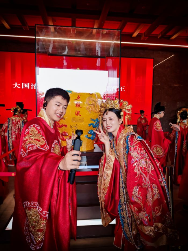 在沉浸式婚恋主题体验环节,五粮液精心设置了“寻缘、知缘、酿缘、证缘”四大篇章体验区,新人们在五粮液东大门寻缘启程,在五粮液酒文化博物馆知缘溯古,在安乐泉园林景区品“浓情蜜意酒”、系“长相厮守结”、拍“幸福和美照”,在鹏程广场,以五粮液瓶楼为背景证缘永恒。