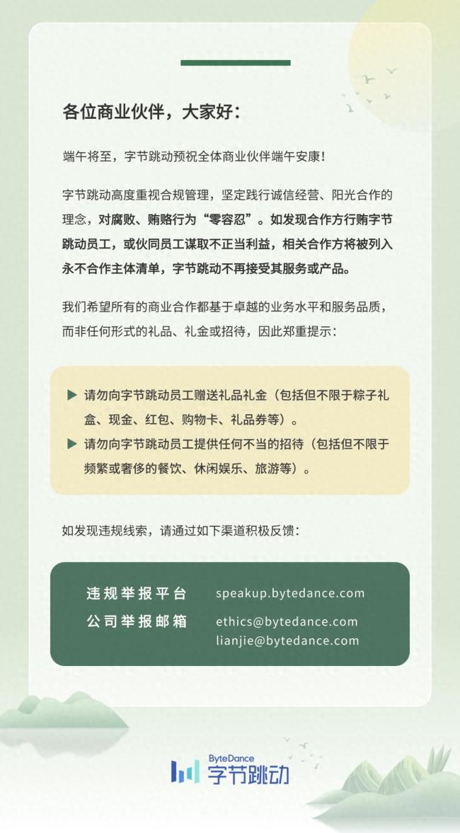 字节跳动还郑重提醒商业伙伴不要向其员工赠送任何形式的礼品礼金,包括粽子礼盒、现金、红包、购物卡、礼品券等;同时避免提供任何不当的招待,如频繁或奢侈的餐饮、休闲娱乐、旅游等活动。
