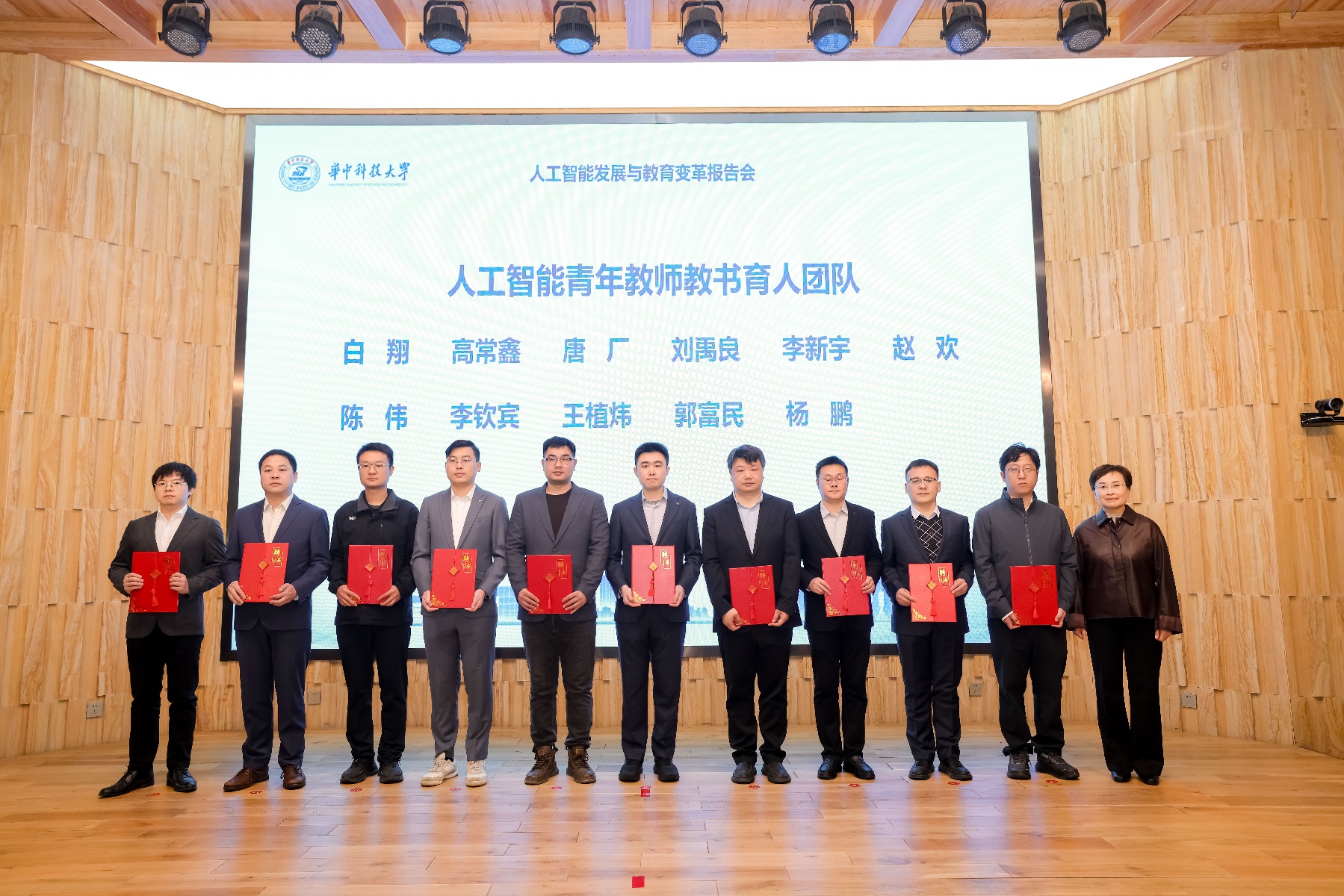 报告会上,来自华科大11个学院的19位教师获聘人工智能研究院首批双聘教授,人工智能青年教师教书育人团队11位成员同步获聘。
