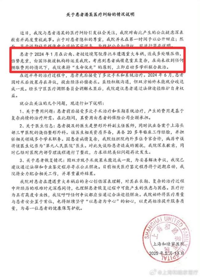 昨天上午,上海和睦家医院发布了一份《关于患者潘某医疗纠纷的情况说明》。潘先生在记者提醒下才知晓这份说明,并仔细阅读后表示其中多处内容与现实不符。首先,《说明》中提到在尚未收到任何预缴费用的情况下,医院立即启动多学科联合救治。潘先生表示,当时他的保险公司派了医疗专机将他从云南送至上海,且提前沟通过保险事宜。其次,对于病历中误将医生周某某记录为“第九人民医院”医生的说法,潘先生认为这个解释非常可笑。他表示,医院工作人员曾多次介绍周某某为“九院专家”。