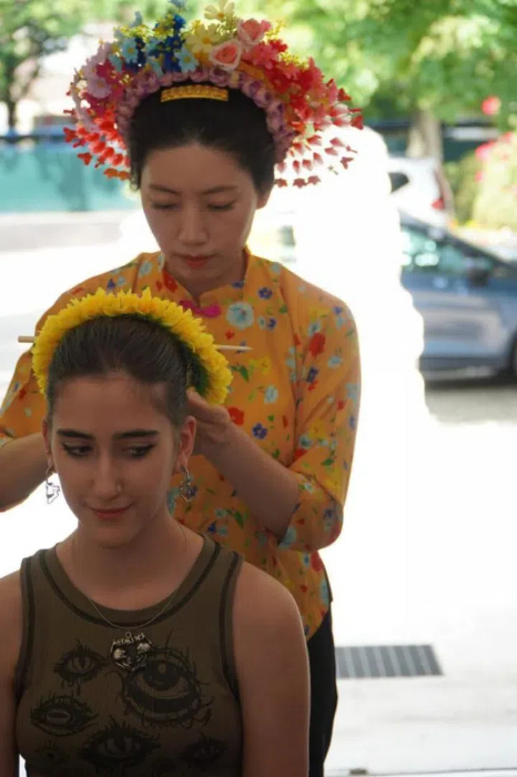 在传统技艺展示区,蟳埔女习俗展示同样热闹非凡,身着“大裾衫、宽筒裤”、头戴“簪花围”的展示人员向师生们讲述了这一独特渔家文化的传承故事,其别具一格的服饰文化引得众人啧啧称奇。
