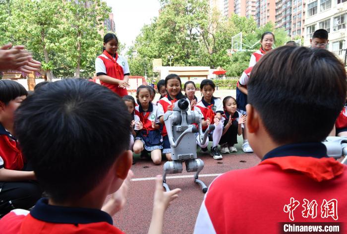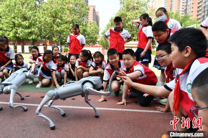5月27日,河北省石家庄市育才小学,学生与机器狗互动。中新社记者 翟羽佳 摄