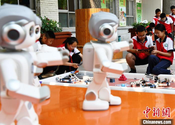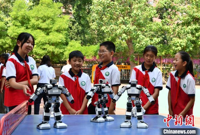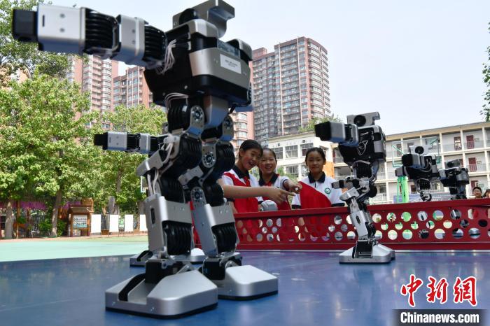 5月27日,河北省石家庄市育才小学,学生观赏机器人舞蹈秀表演。中新社记者 翟羽佳 摄