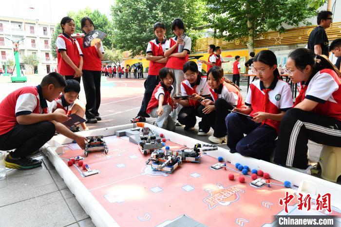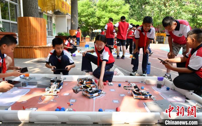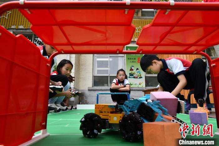 5月27日,河北省石家庄市育才小学,学生参与体验多种科技赛事项目。中新社记者 翟羽佳 摄