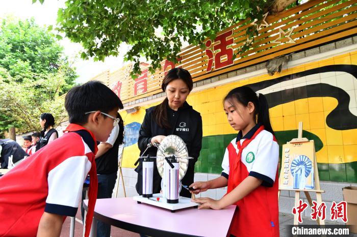 5月27日,河北省石家庄市育才小学,学生体验静电感应起电器。中新社记者 翟羽佳 摄