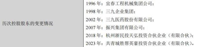 不难看出,自成立以来,派林生物经历了多次名称的变更,背后则代表着其控股股东的变更。根据派林生物2024年年报,其控股股东1998年变更为三九企业集团;2002年变更为三九医药股份有限公司;2007年变更为振兴集团有限公司;2018年变更为杭州浙民投天弘投资合伙企业(有限合伙);2023年变更为目前的共青城胜帮英豪投资合伙企业(有限合伙)。