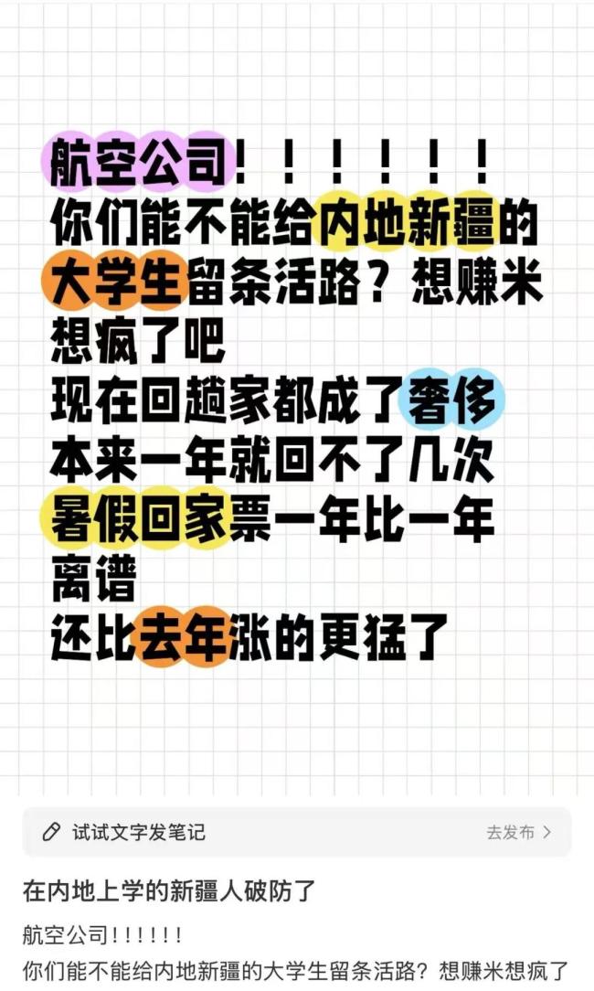 气急败坏的新疆籍大学生们随即在社交新媒体上发起了一轮又一轮吐槽,甚至整出了专用吐槽贴,在各个讨论新疆机票价格为什么这么贵的帖子下面整齐划一的评论抗议,发泄自己的不满情绪。