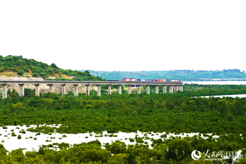 肯尼亚蒙巴萨红树林旁,一列货运列车行驶在蒙内铁路线上。人民网记者 黄炜鑫摄