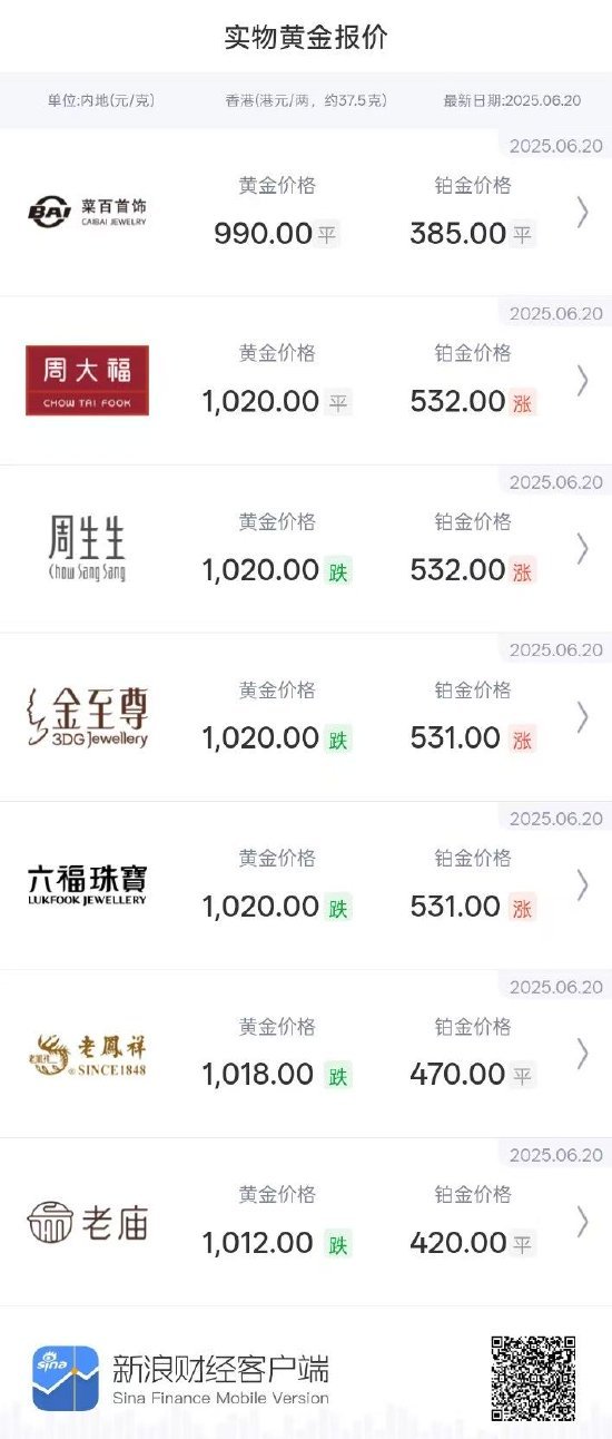 国内黄金品牌的金饰价格也持续走低,四天内每克价格下降了15元至19元不等。以周生生为例,其足金饰品价格在五天内出现了四次下跌。6月15日至20日期间,周生生的足金饰品每克单价分别为1038元、1037元、1024元、1023元、1023元和1020元,到6月20日,每克价格较15日下跌了18元。花旗报告指出,黄金价格已经上涨至名义和实际水平,与黄金的边际成本脱钩,可能即将迎来“最后的辉煌”。