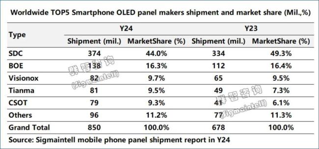 以2024年采用OLED屏幕的智能手机市场为例,SDC(三星)市场份额为44%,呈较大幅度的下滑趋势;京东方以16.3%拿下第二,较去年小幅下滑;而维信诺、天马微电子、TCL华星(CSOT)的市场份额则呈不同幅度的增长。(详情见:打破韩系垄断,中国首条高世代OLED面板产线将落地成都)