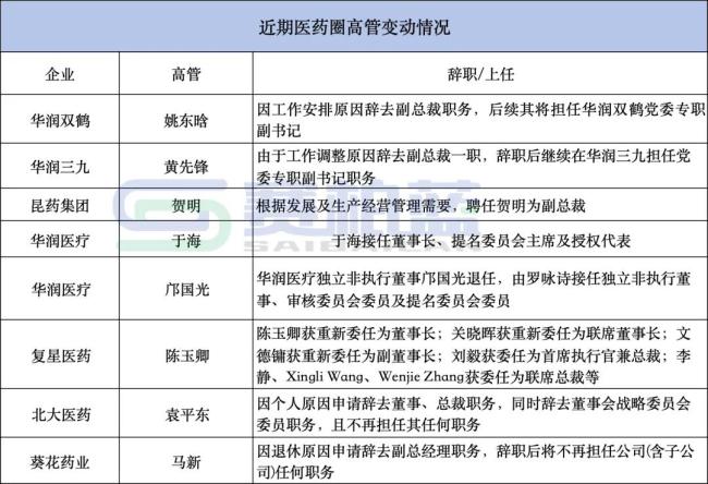 截至目前,已经有多家大型药企高管发生变动,涉华润三九、华润双鹤、复星医药、北大医药、葵花药业......