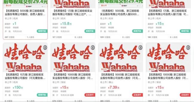 而据阿里资产拍卖平台信息显示,5月31日至6月1日,共计28笔娃哈哈实业公司股权集中上拍,涉及股数从5000股至10万股不等,起拍价跨度极大,由象征性的1元至150万元。