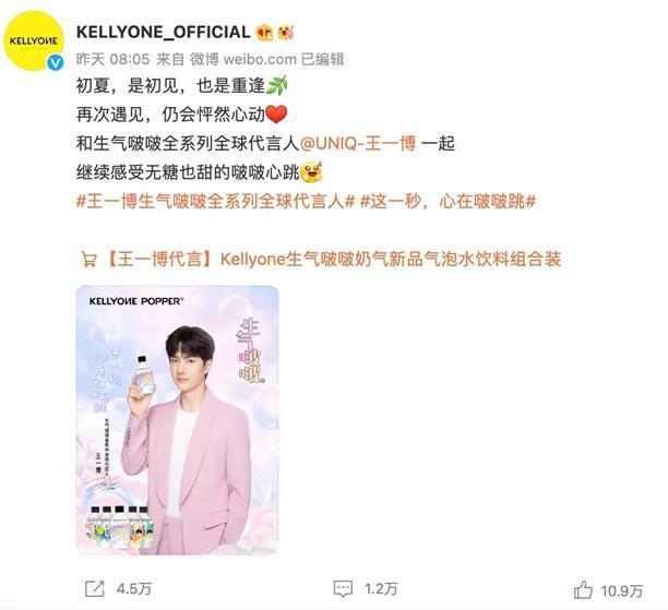 所以,她砍掉了王力宏的代言,说人家年纪大了,审美疲劳。创立新品牌KellyOne,与王一博合作推出无糖气泡水。