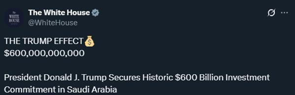 美国政府对此辩解称,这些只是“在沙特达成的众多变革性协议中的一小部分”,未来还会有更多此类协议达成。白宫在社交媒体上吹捧“特朗普效应”,特意将6000亿美元投资的每一个“0”都写出。