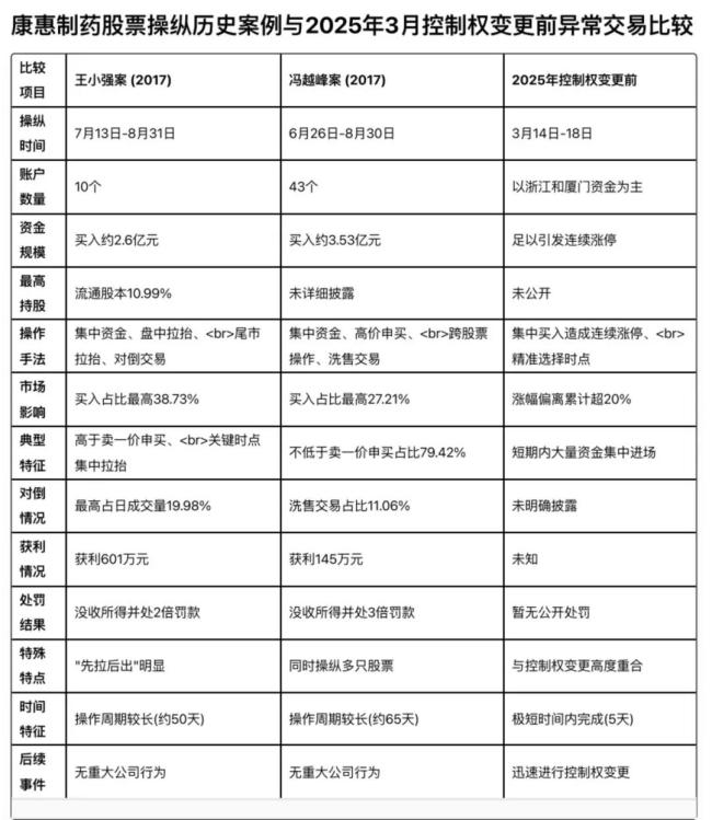 对比前后特征,被查实的“康惠制药股票操纵案”体现出典型的“庄家操盘”、“职业操盘”,最新这波异动则与公司控制权转让“闪电战”高度关联。