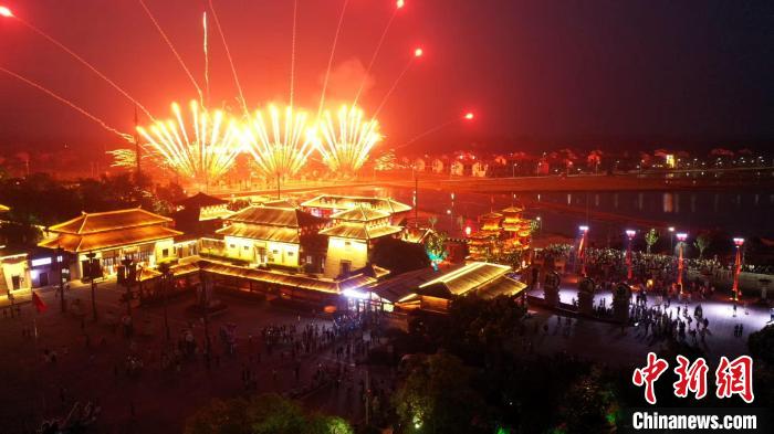 图为璀璨烟花点亮湖北三国赤壁古战场。(无人机照片)陈红菊 摄