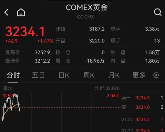 国际金价走势再度逆转,5月19日,现货黄金和COMEX黄金开盘一度直线拉升。截至9时40分左右,现货黄金涨超0.7%,盘中一度涨超1%,重回3240美元。COMEX黄金价格上涨1.47%,盘中涨超2%。