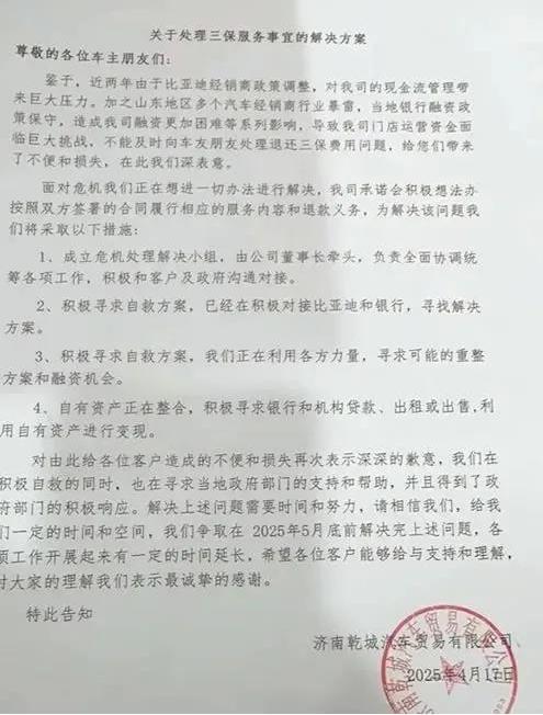 根据网传的一份济南乾城在4月17日发布的《关于处理三保服务事宜的解决方案》公告,济南乾城称:“近两年由于比亚迪经销商政策调整,对我司的现金流管理带来巨大压力。加之山东地区多个汽车经销商行业暴雷,当地银行融资政策保守,造成我司融资更加困难等系列影响,导致我司门店运营资金面临巨大挑战”。