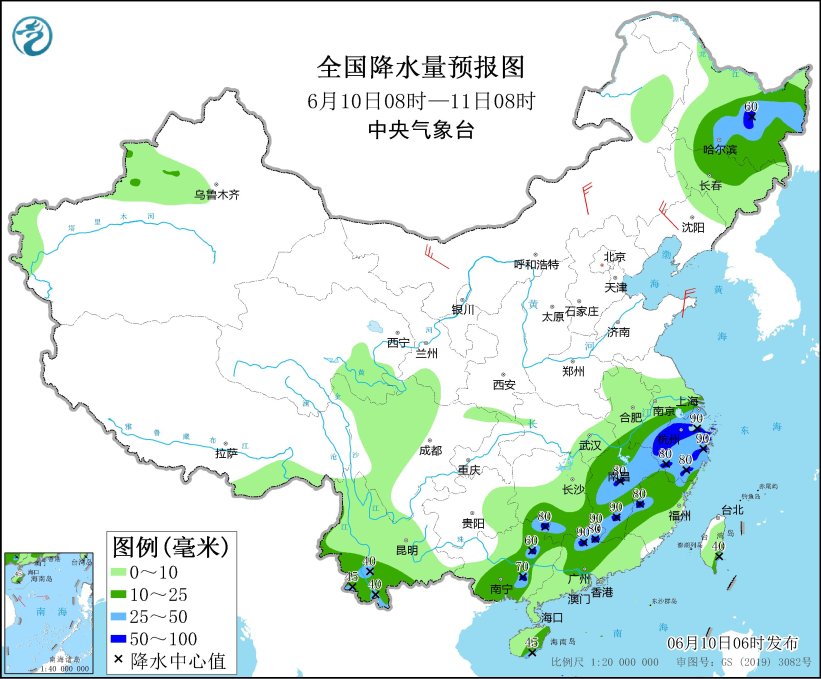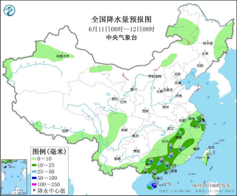 6月10日08时至11日08时,黑龙江中东部、吉林北部、云南西南部、江南中东部和西南部、华南中西部等地部分地区有中到大雨,其中,黑龙江中部、安徽南部、浙江、江西中南部、广东北部、广西中东部等地局地有暴雨(50~90毫米)。内蒙古中西部、辽宁、山东半岛等地部分地区有4~5级风。南海南部海域将有5~7级风,阵风8级。