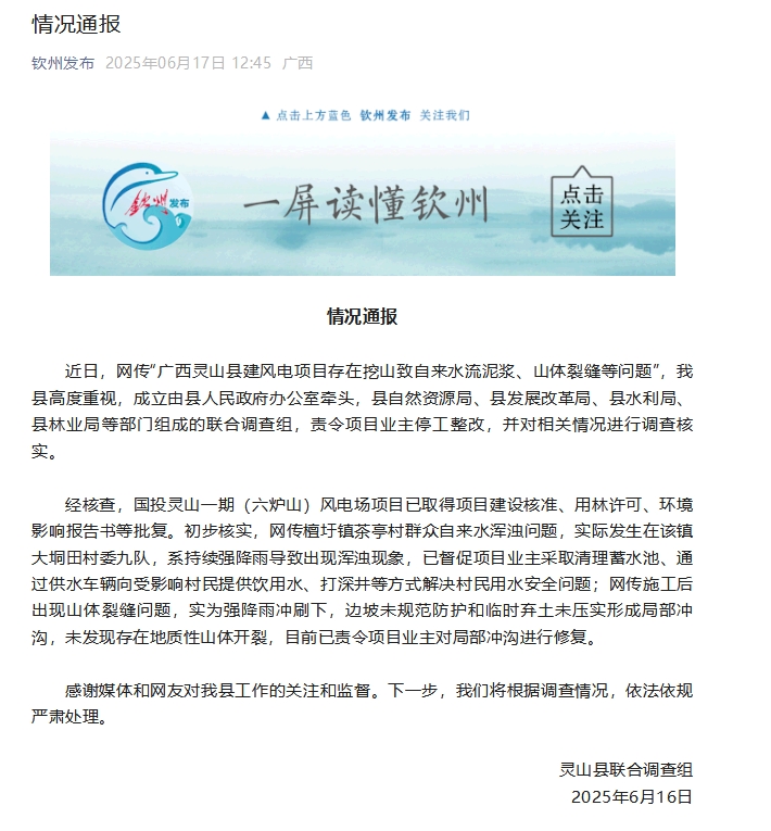 中新网6月17日电 据“钦州发布”微信公众号消息,广西省钦州市灵山县联合调查组16日发布情况通报称,近日,网传“广西灵山县建风电项目存在挖山致自来水流泥浆、山体裂缝等问题”,灵山县高度重视,成立由县人民政府办公室牵头,县自然资源局、县发展改革局、县水利局、县林业局等部门组成的联合调查组,责令项目业主停工整改,并对相关情况进行调查核实。