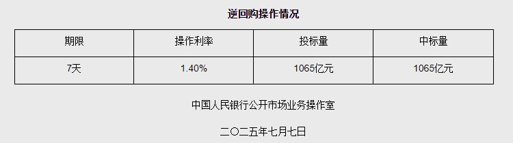 中新网7月7日电 据中国人民银行网站消息,2025年7月7日中国人民银行以固定利率、数量招标方式开展了1065亿元逆回购操作。具体情况如下: