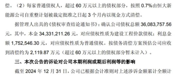 公告详细披露了恒大新能源汽车重整计划中的债务清偿方案,包括区分债权的优先级:建设工程价款债权在建设工程评估价值范围内享有优先受偿权,优先受偿部分由恒大新能源汽车自重整计划被裁定批准之日起3个月内以现金方式一次性全额清偿。