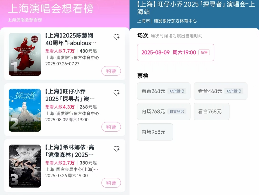 截至目前,“旺仔小乔”上海演唱会想看人数已超4.3万人,位列上海演唱会想看榜前三名。演唱会票价从268元至968元不等,其中268元的看台票、468元的看台票和768元的内场票已显示缺货,仅有768元的看台票和968元的内场票还在售。