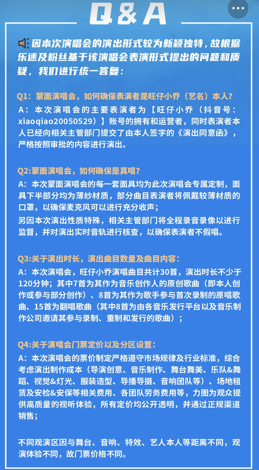 关于网友先前质疑的“演出时长只有90分钟”“全是翻唱”,主办方表示,“旺仔小乔”本次演唱会不少于120分钟。演出曲目共有30首,其中7首为其作为音乐创作人创作或参与部分创作的原创歌曲,8首为其作为歌手参与首次录制的原创歌曲,还有15首翻唱歌曲。