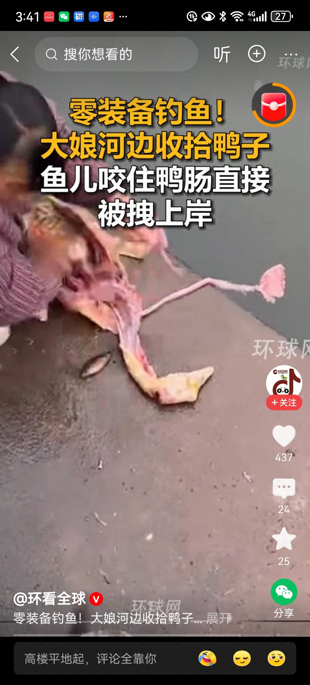 它大概以为这是什么美味的大餐,大娘感觉到了手里的鸭肠被什么东西拽住,下意识往回一拉结果竟把这条贪吃的鱼连同鸭肠一起拖上了岸,鱼上岸后还在石阶上扑腾,嘴里依然死死咬着那截鸭肠好像生怕到嘴的食物跑了,有细心的网友注意到整个过程中大娘连鱼竿都没用,更别说鱼钩和鱼线了,有人开玩笑说这才是真正的“愿者上钩”,姜太公钓鱼还用了直钩呢,大娘连钩都省了。