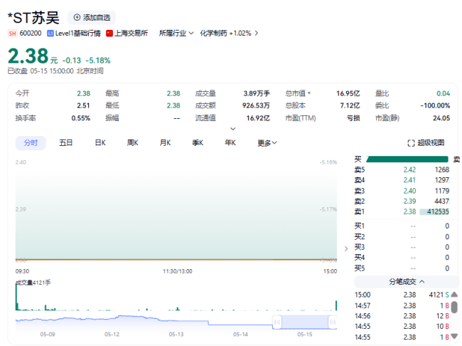 5月15日,*ST苏吴(600200)“一”字跌停,报跌停价2.38元/股,跌幅为5.18%。