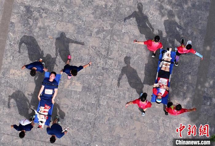 参赛队伍参与担架搬运应急救护任务。中新网记者 泱波 摄