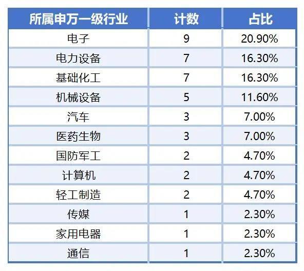 从行业分布看,根据申万一级行业分布,2024年出现归母净利润同比下降的43家上市公司分布在12个领域,其中,电子、电力设备、基础化工分别涉及9家、7家、7家上市公司,位居前三。