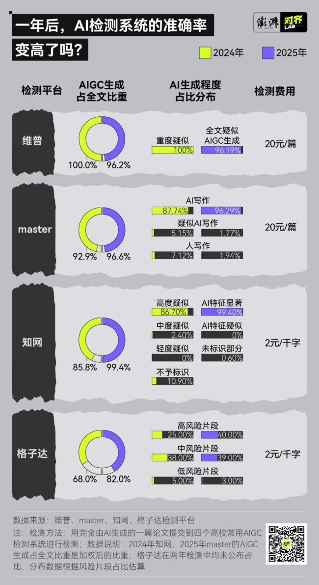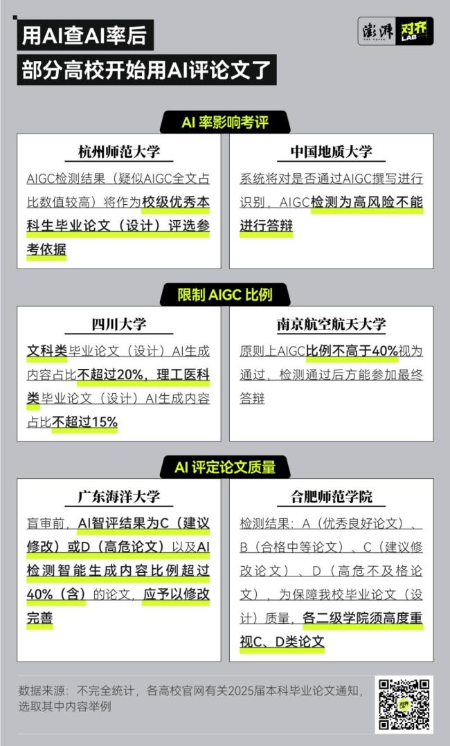 2024年初,福州大学、中国传媒大学等高校陆续发布了毕业论文(设计)AIGC检测的通知。相比2024年,今年有更多高校将AIGC检测列入了毕业论文评价体系。西南大学、浙江科技大学、西南交通大学纷纷颁布关于2025届本科毕业论文(设计)AIGC检测的通知。部分去年已采纳AIGC检测的高校则在今年提出了更细致的规定。以福州大学为例,校方指导文件明确指出“AIGC全文检测值应≤20%”,并规定终稿环节“查重检测或AIGC检测第二次才通过的论文最终总评成绩只能记作及格”。