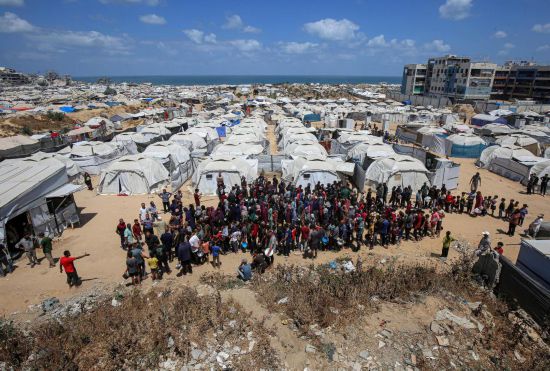 5月28日,人们在加沙城西部的沙提难民营领取救助食物。新华社发(里泽克·阿卜杜勒贾瓦德摄)