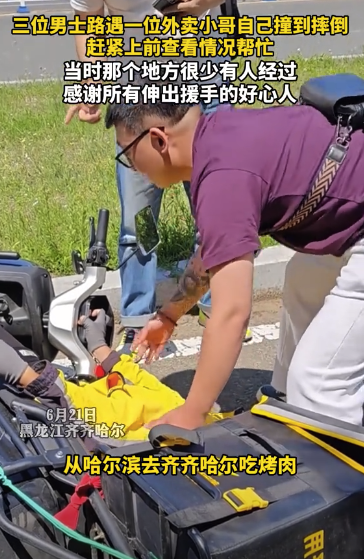 一位外卖小哥不慎摔倒,三位男士经过伸出援手。