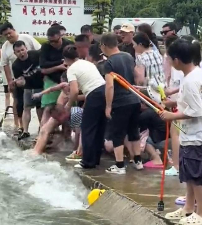 6月29日在安徽宣城,一名男孩跌入湍流并被吸入桥洞下。危急时刻,一位白衣大哥迅速抓住孩子的手臂,众人合力将男孩从激流中拽回,并成功将其拉上岸。