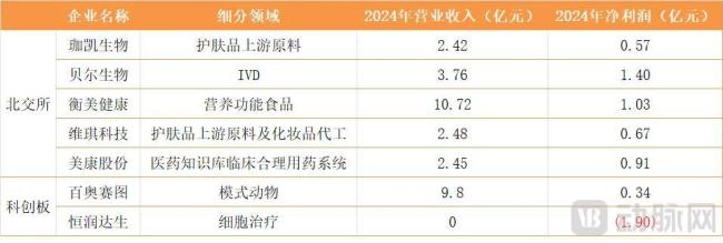 这两家企业正乘着护肤品市场下游国货品牌崛起、功效性护肤理念普及的东风,实现业绩高速增长。珈凯生物凭借在植物提取功效原料领域的领先市场份额,2024年营业收入2.42亿元,同比增长11.46%,净利润5694万元,同比增长19.83%,毛利率达63.09%。而维琪科技作为化妆品原料和化妆品成品(ODM和OBM)生产企业,2024年营收2.48亿元,同比大增50.23%,净利润达6691.53万元,同比增长93.32%,其在多肽原料开发方面的核心技术,使其在众多化妆品原料商中脱颖而出。