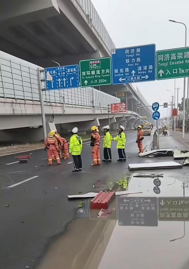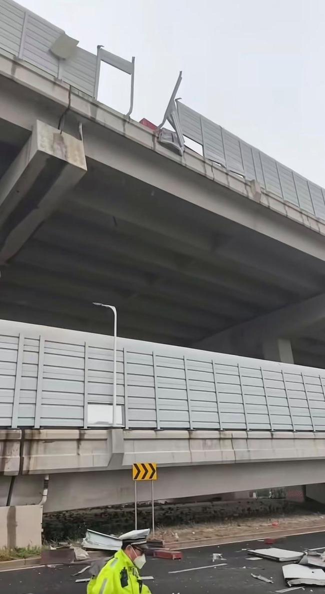 声屏障被撞碎后,不少碎片和零件掉落至下方的地面道路上,途经车辆驾驶员为躲避危险纷纷停车。接到报警后,交警、消防和医疗急救人员相继到场处置。事故导致两辆货车上各有一人受伤,伤者已被送医救治。