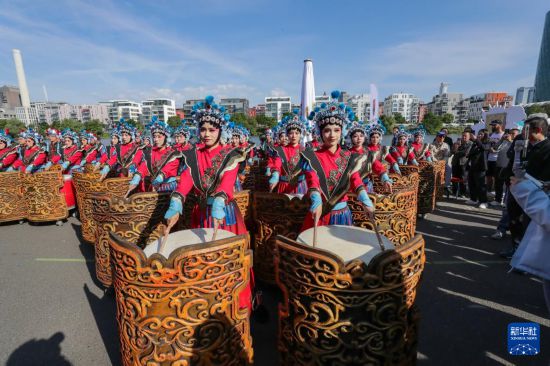 5月24日,演员在第二届德国法兰克福国际龙舟友谊赛期间表演中国陕西神木杨家将战鼓。新华社记者 张帆 摄