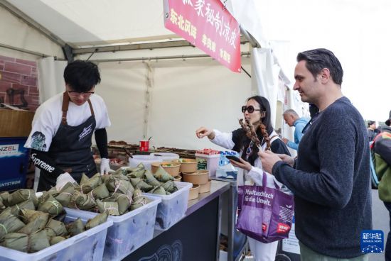 5月24日,人们在第二届德国法兰克福国际龙舟友谊赛赛场周边设置的美食摊位购买美食。新华社记者 张帆 摄