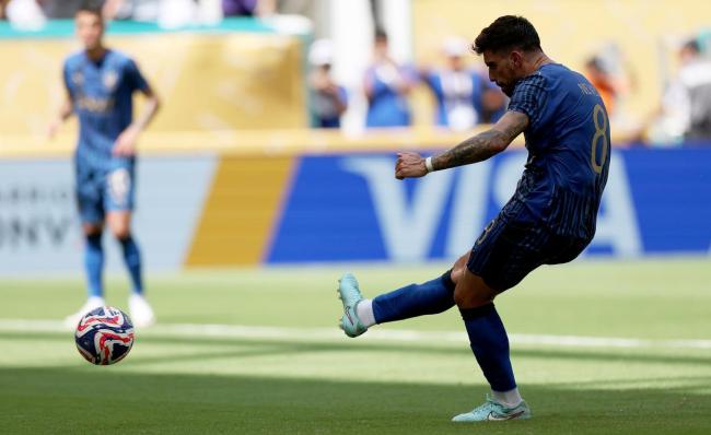 上半场,利雅得新月比皇马更早进入比赛状态,一度占据场上主动,多次通过快速进攻威胁皇马球门。第20分钟,洛迪为利雅得新月打入一球,但因越位被判无效。第34分钟,沉寂许久的皇马利用防守反击打入一球,罗德里戈右路横传,贡萨洛·加西亚后点包抄得手。不过“白衣军团”的领先优势并未保持太久,第41分钟,皇马中后卫阿森西奥禁区内拉人犯规,被判罚点球,鲁本·内维斯主罚为利雅得新月扳平比分。