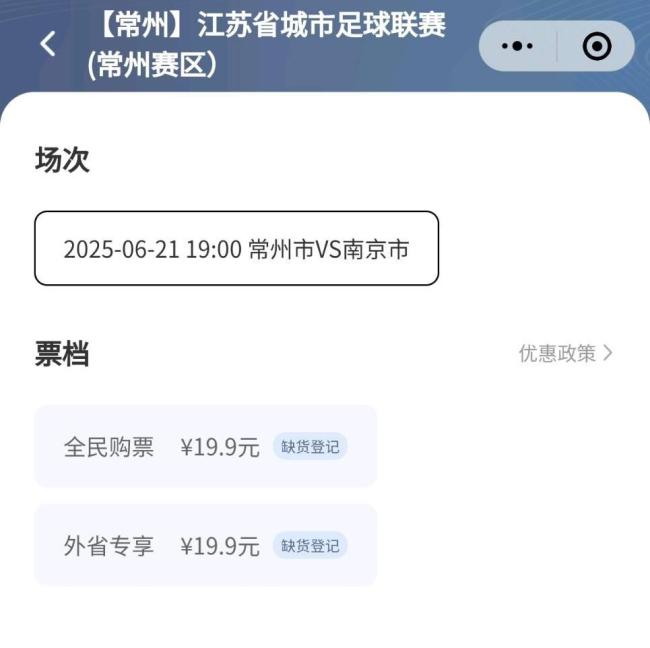 2025江苏城市足球联赛6月21日常州主场对阵南京的门票已全部售罄,不再安排第二轮售票。本次门票中外省专享通道与全民购票通道放票比例为1:3.9。由于预约购票人数达到76万人,导致购票成功率较低。除现场观赛外,球迷们还可以通过常州发布视频号、常州市体育局视频号、常州广播电视台生活频道等平台观看直播。常州市民还可以在文化广场、江南环球港环球广场、蓝海豚欢乐世界中心广场、舜山小镇广场、运河五号大广场、红梅公园大草坪等街区景区的大屏观看直播。