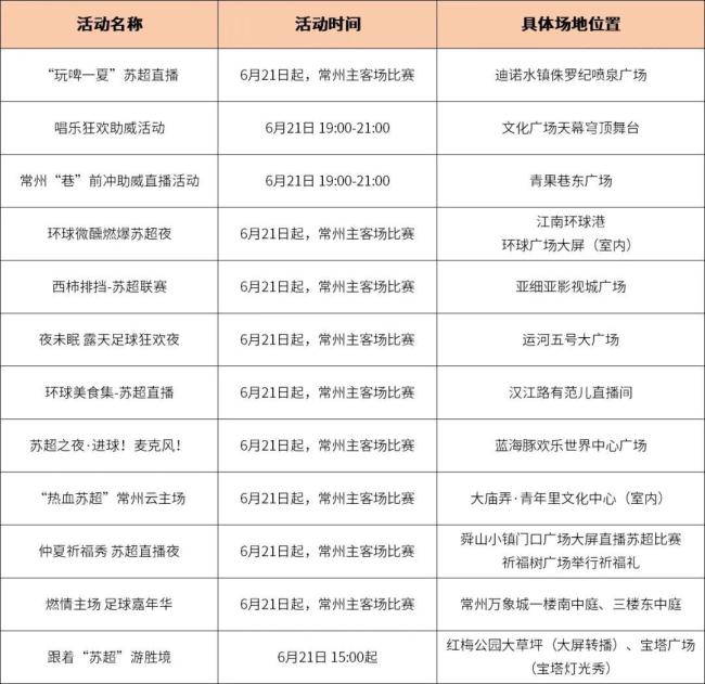 常州还设置了多个户外大屏对比赛进行直播,具体场地位置包括文化广场、江南环球港环球广场、蓝海豚欢乐世界中心广场、舜山小镇广场、运河五号大广场和红梅公园大草坪。
